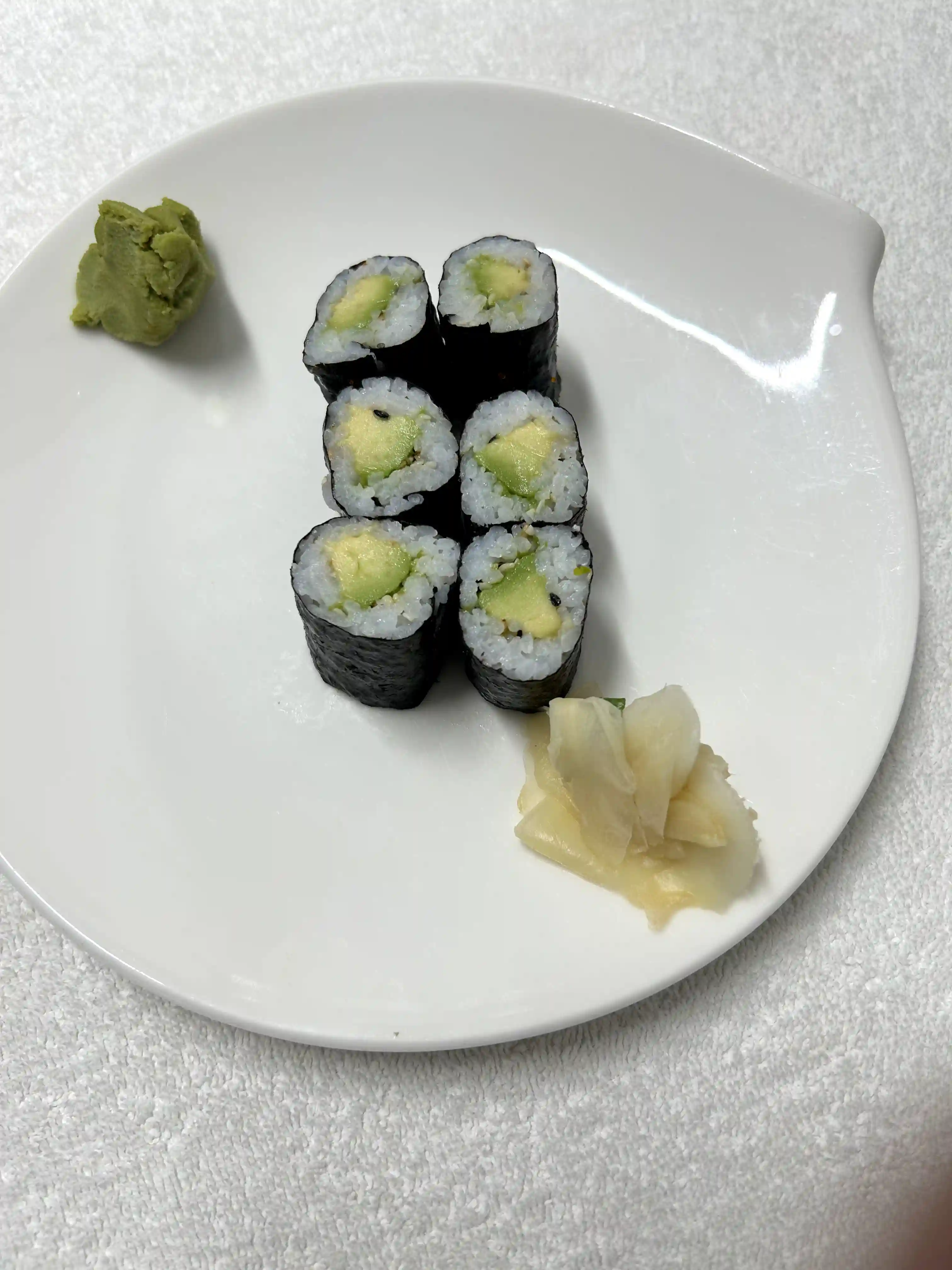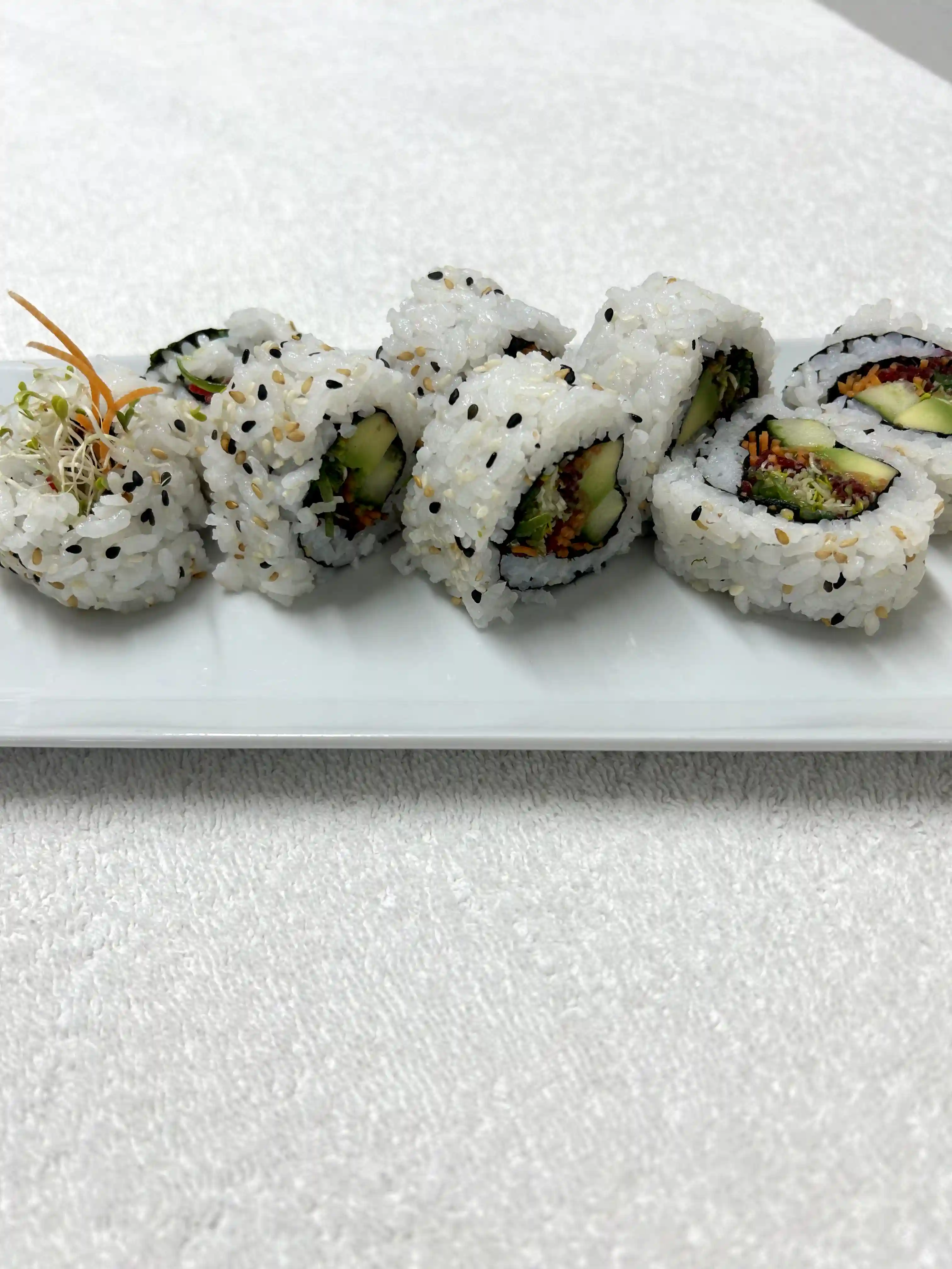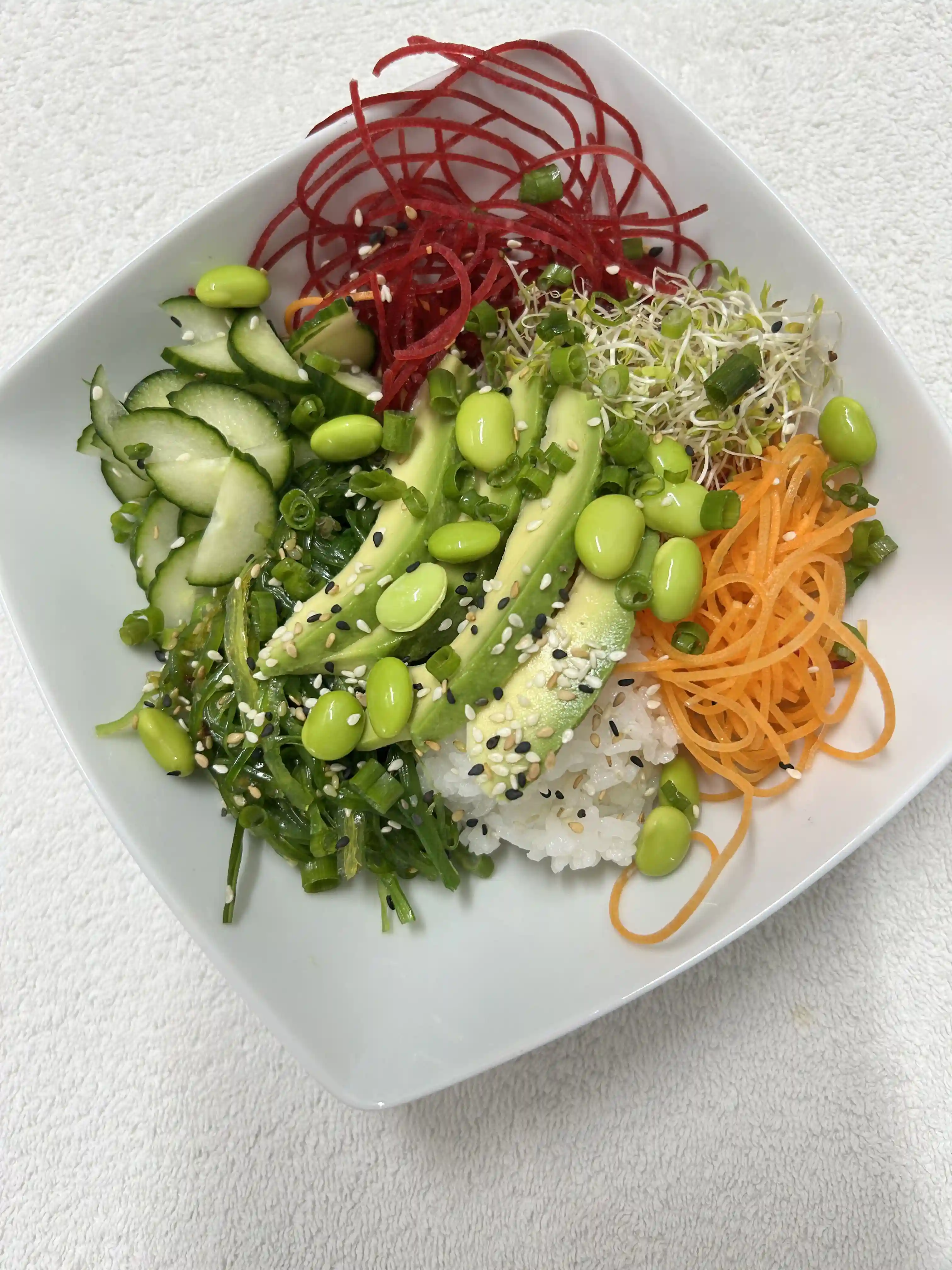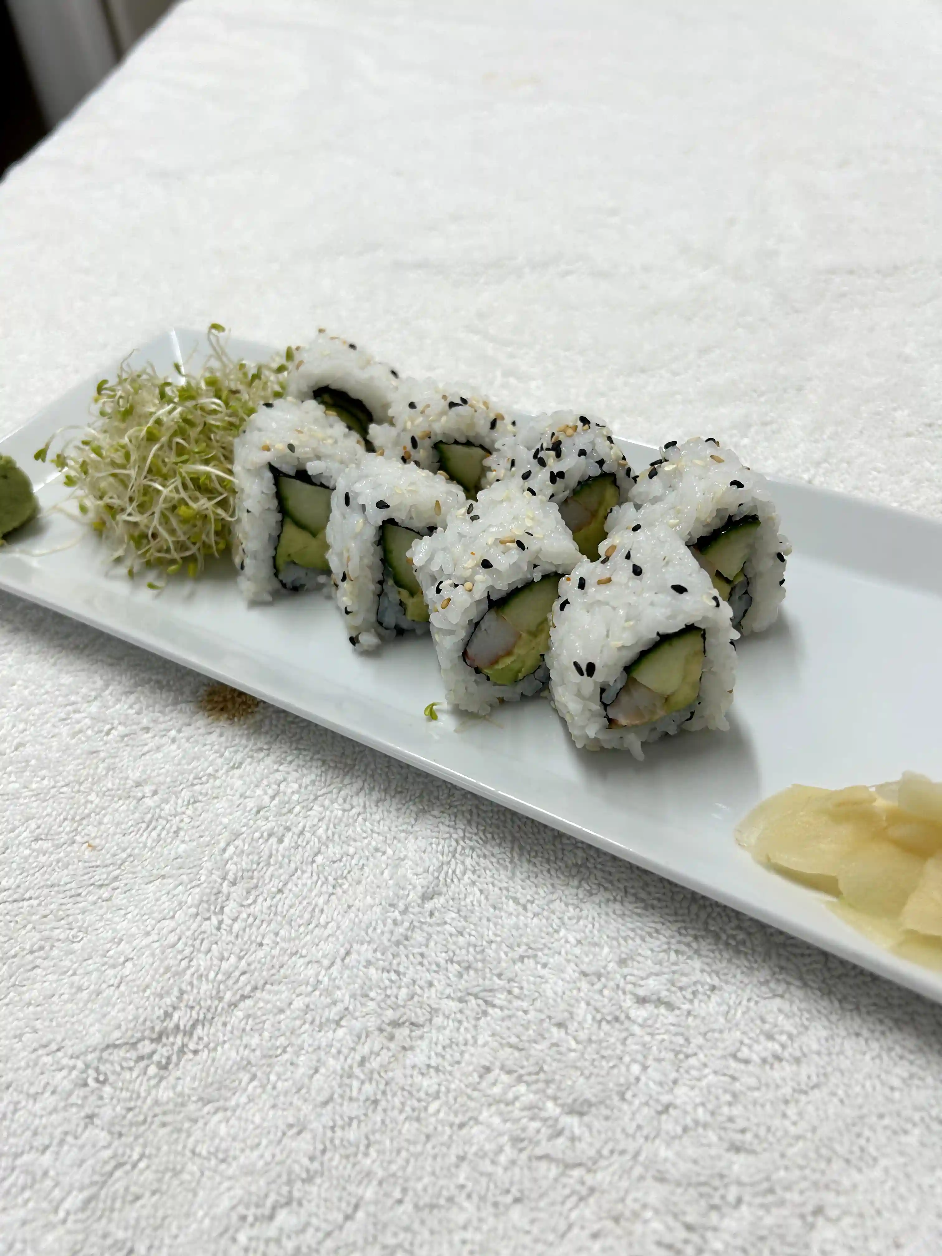Riz, concombre, avocat, edamame, carotte, wakame, alfalfa
