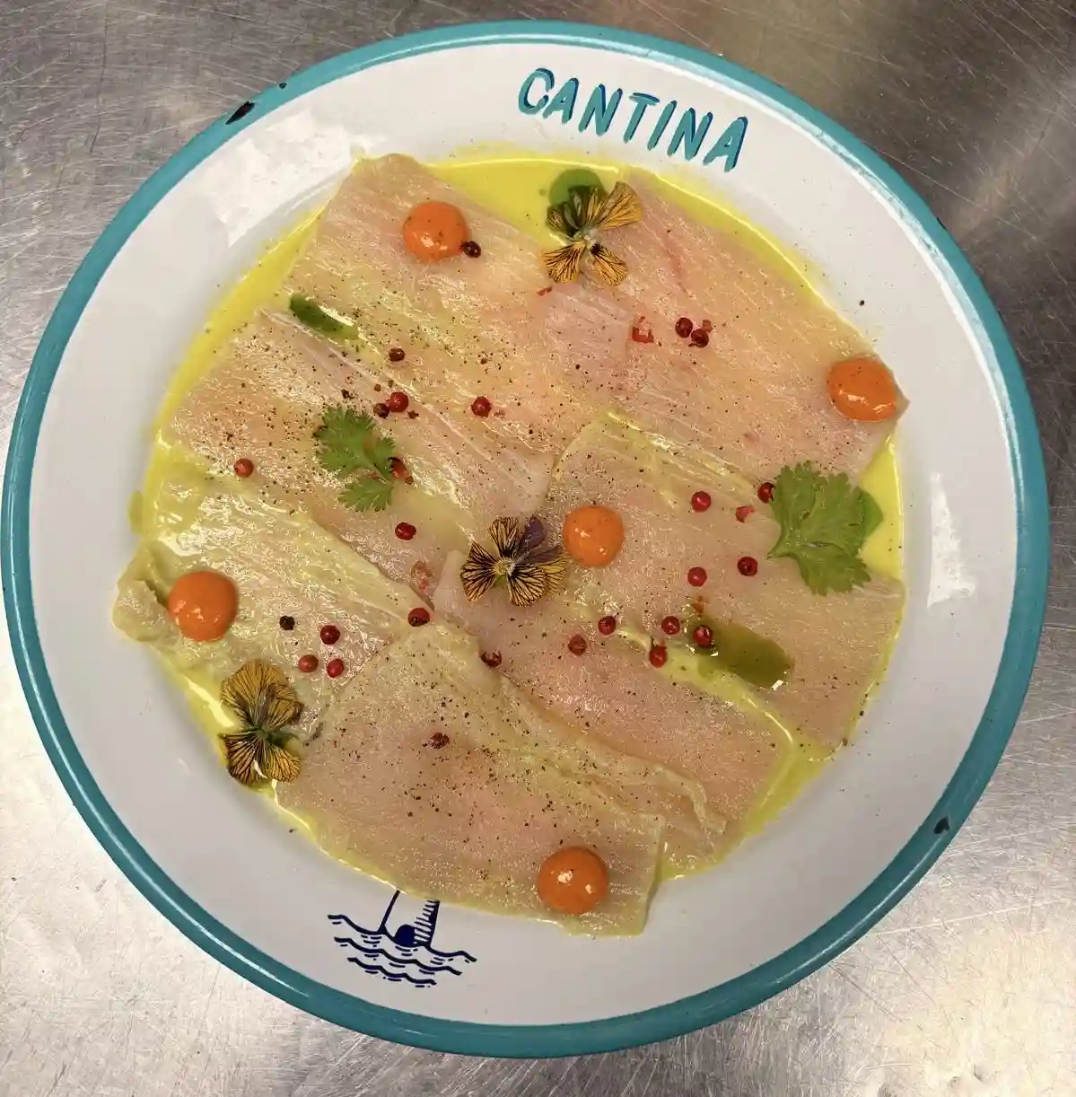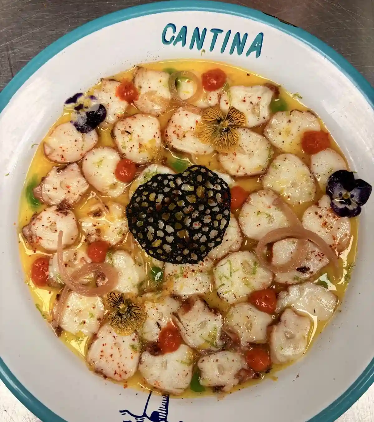 Fine tranche de poulpe, huile d'olive, citron vert, baies roses
