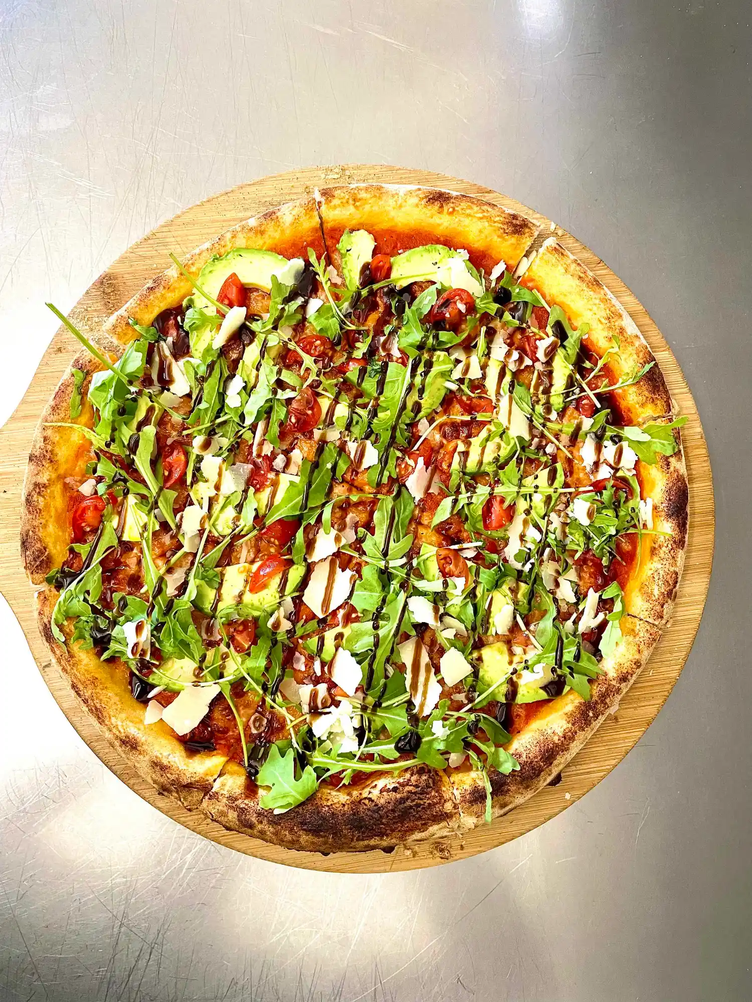 Roquette, poulet, mozzarella, oignons frits, tomates cerises, olives, parmesan, huile d'olive, crème balsamique.