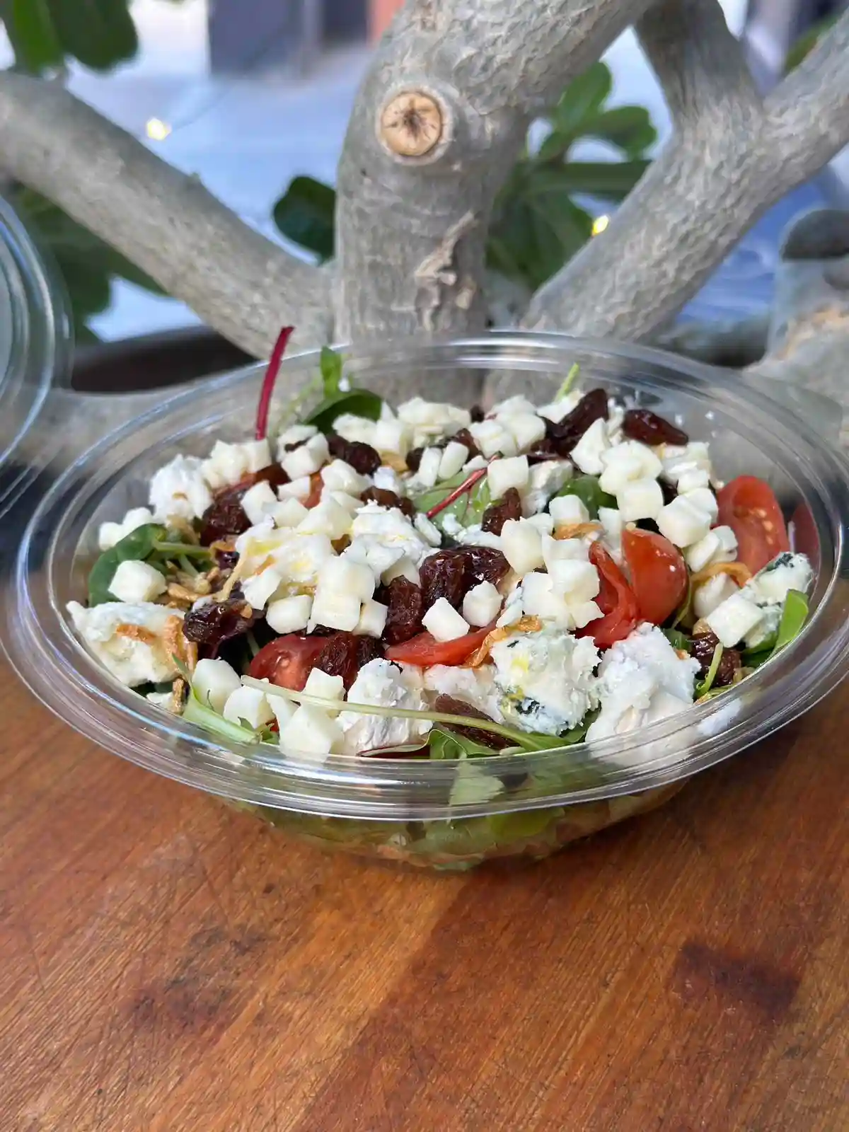 Roquette, fromage de chèvre, gorgonzola, oignons frits, tomates cerises, raisins secs, huile de basilic