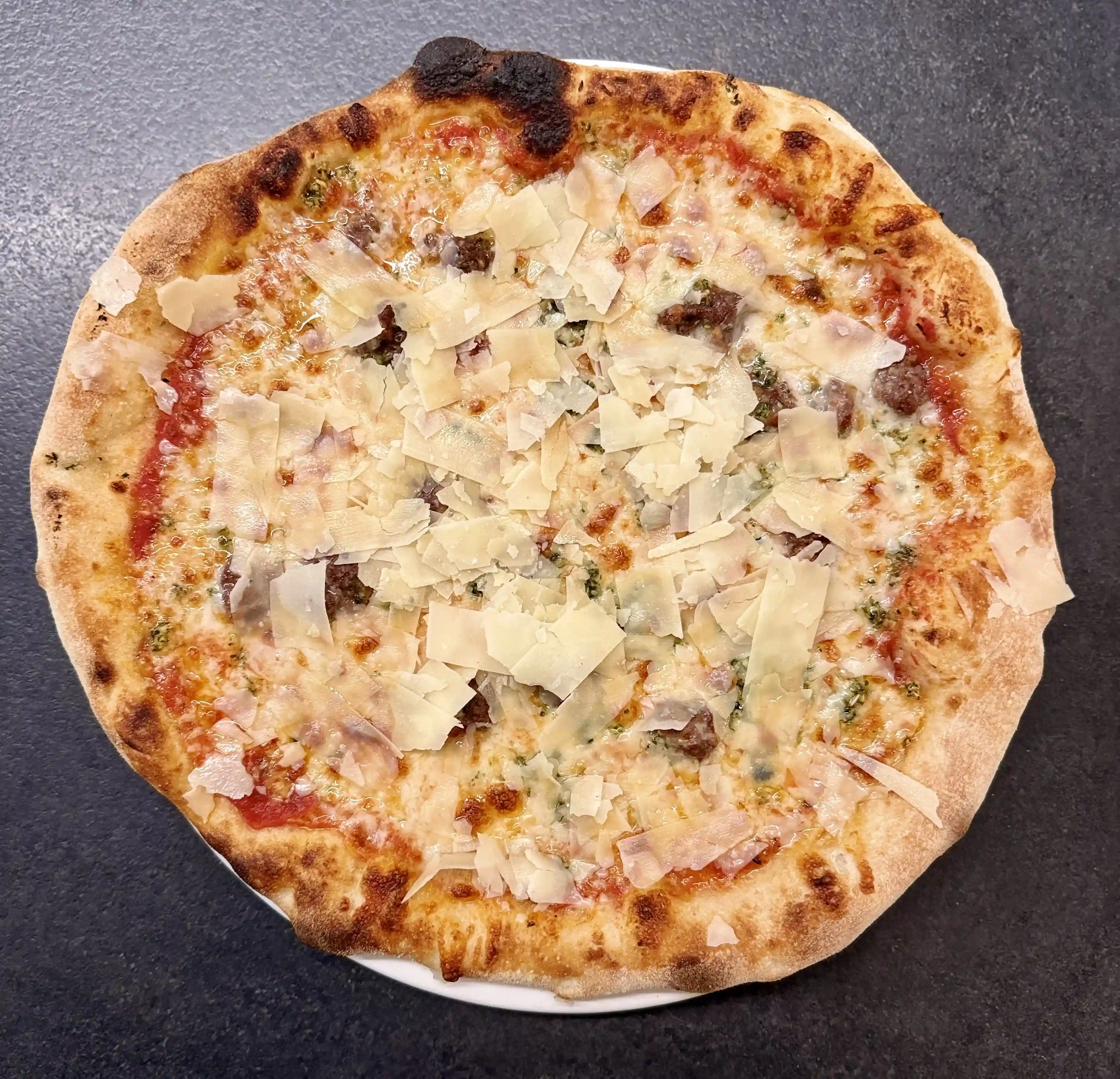 Mozzarella, tomates cerises cuites, origan, jambon cru, pécorino truffé, huile de truffe