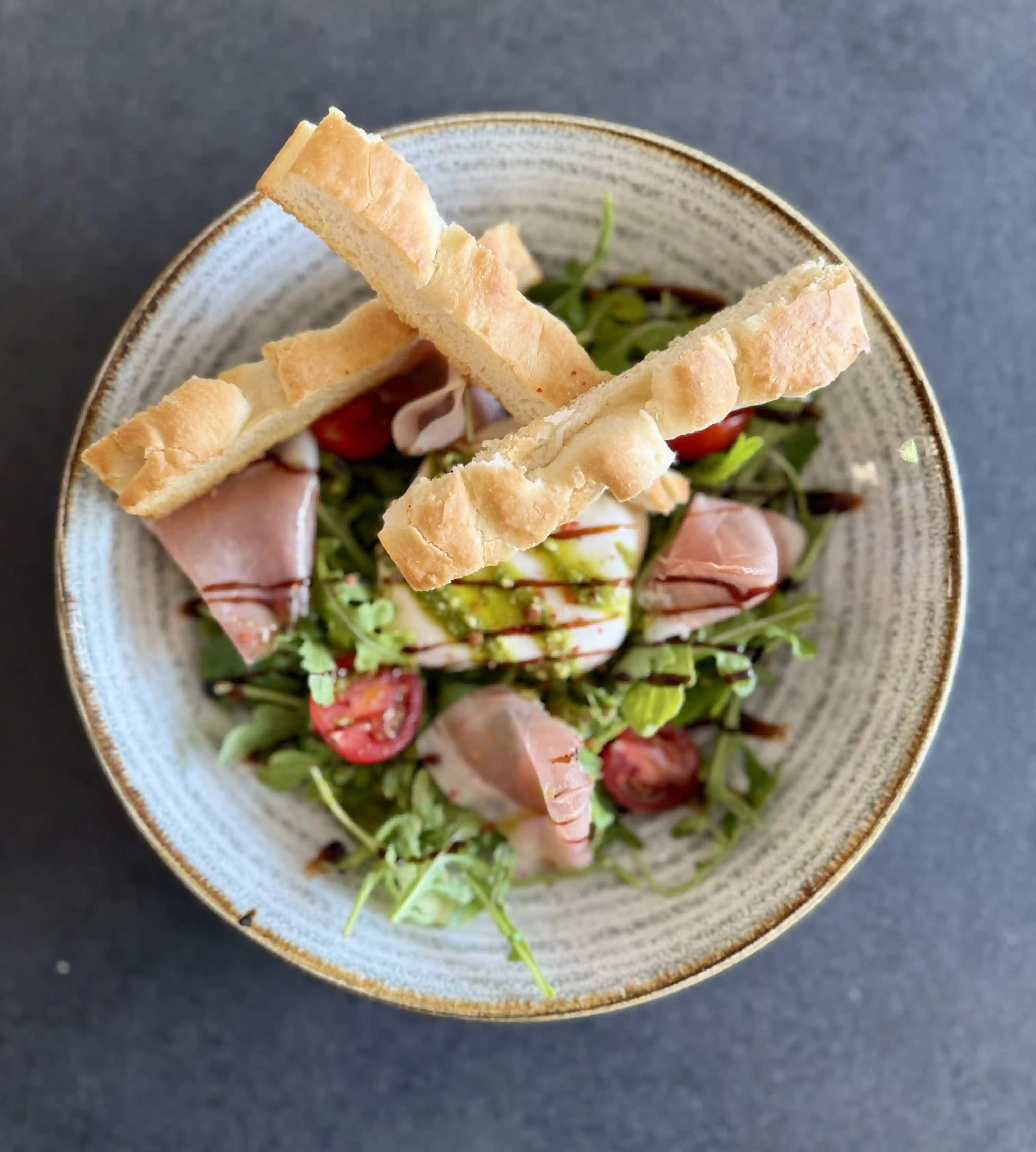 Roquette, focaccia, burrata, tomates cerises, pesto, speck