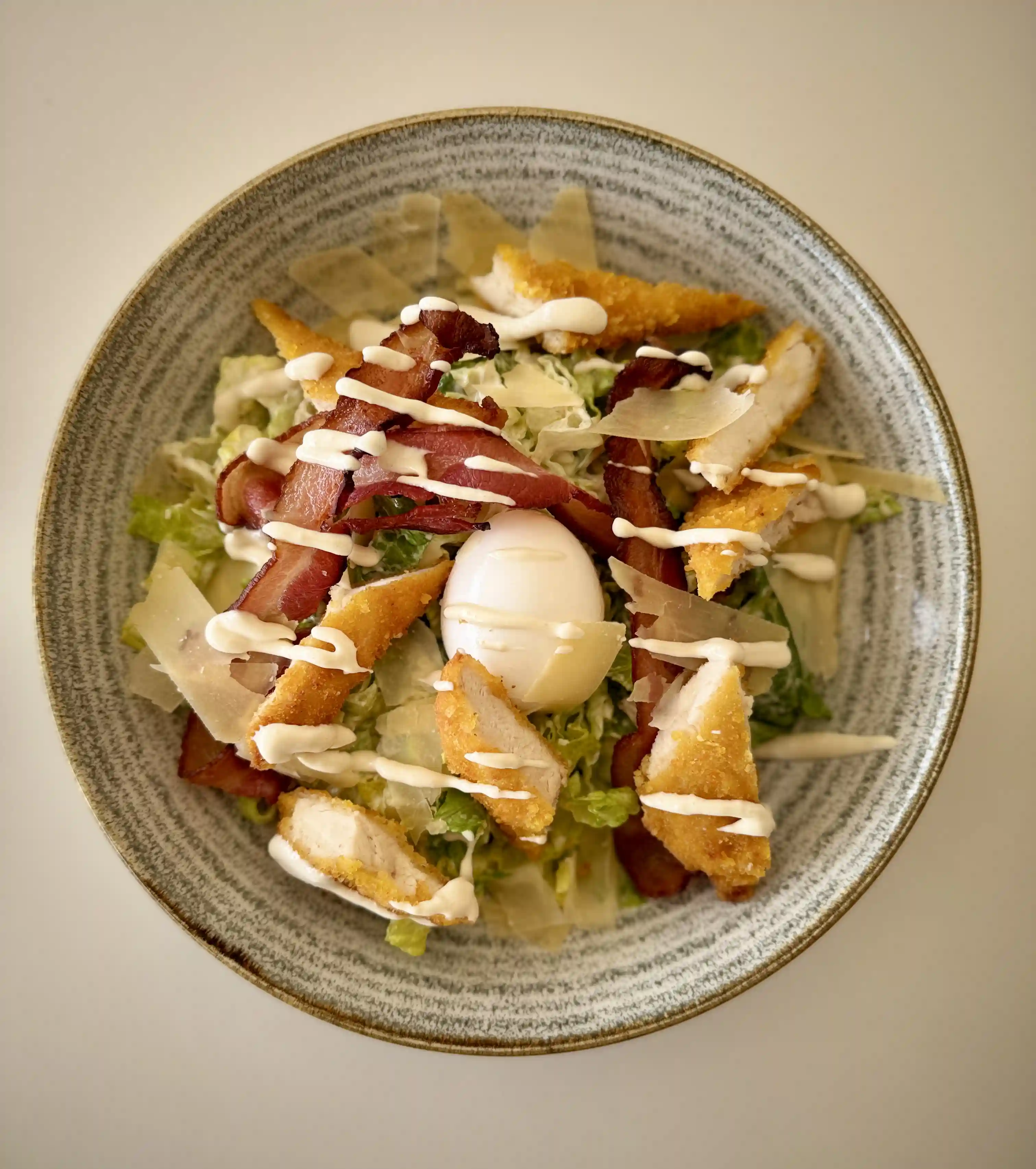 Romaine, volaille pannée, parmesan, bacon, œuf, sauce césar